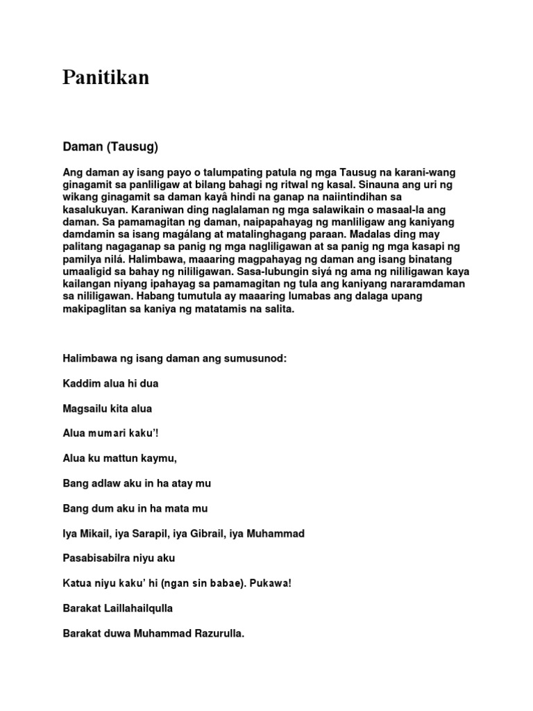 Jun 18 2018 DAMAN Tausug Ito ay isang payo o talumpating patula ng mga Tausug na karaniwang ginagamit sa panliligaw at isang bahagi ng ritwal ng kasalan. 3 talking about this. Ito ay isang awitin ng pag-ibig mula sa Samal Sulu.