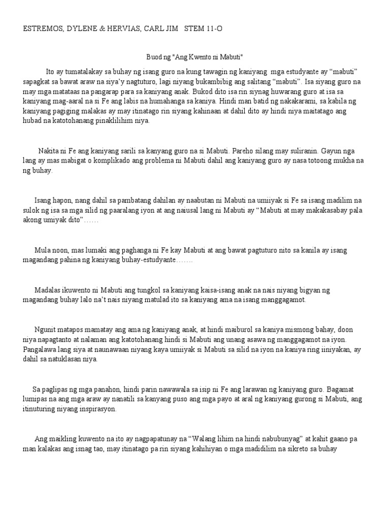 Sa Florante at Laura. KWENTO NI MABUTI Sa paksang ito ating tatalakayin kung ano ang buod ng Kwento Ni Mabuti at ang mga aral na makikita sa kwento. Tandang Basiong Macunat isang aklat na naglalaman ng mga payo ng kura at mga salaysay tungkol sa kasamaang dulot ng pagpapaaral ng mga anak Umiibis bumababa Victoria karuwahe Kabanata 13 Ang Klase sa Pisika Isang mahaba at rektangular na bulwagan ang silid ng klase sa Pisika maluluwang ang bintana nito at narerehasan ng bakal.